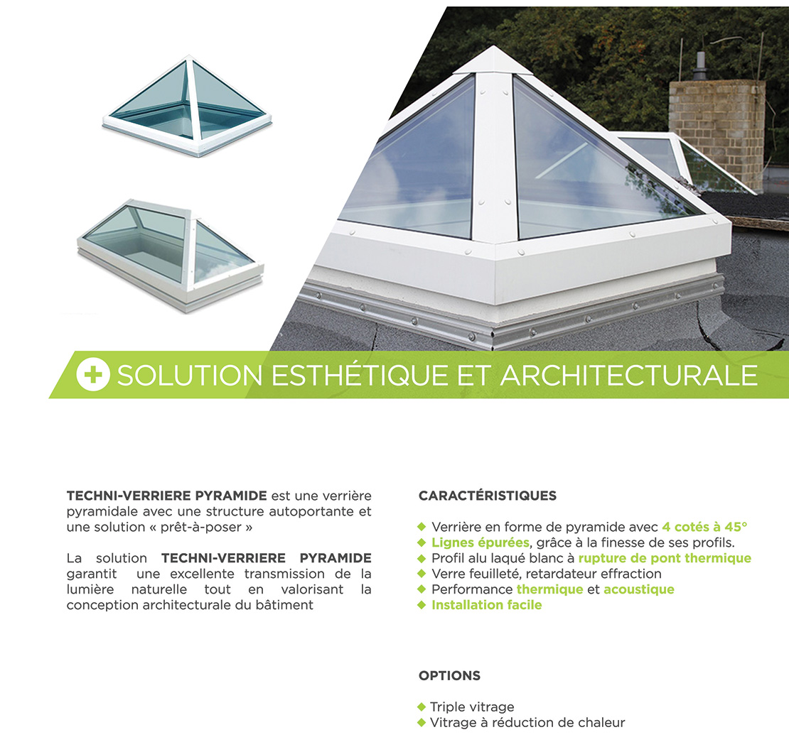 TECHN-VERRIERE PYRAMIDE est une verriére pyramidale avec une structure autoportante. Cette vérriére architecturale est livrée "pret-à-poser" avec sa costiére polyester deja montée. cette verriére de toit permettra d'apporter une solution esthétique à toutes les toitures plates.