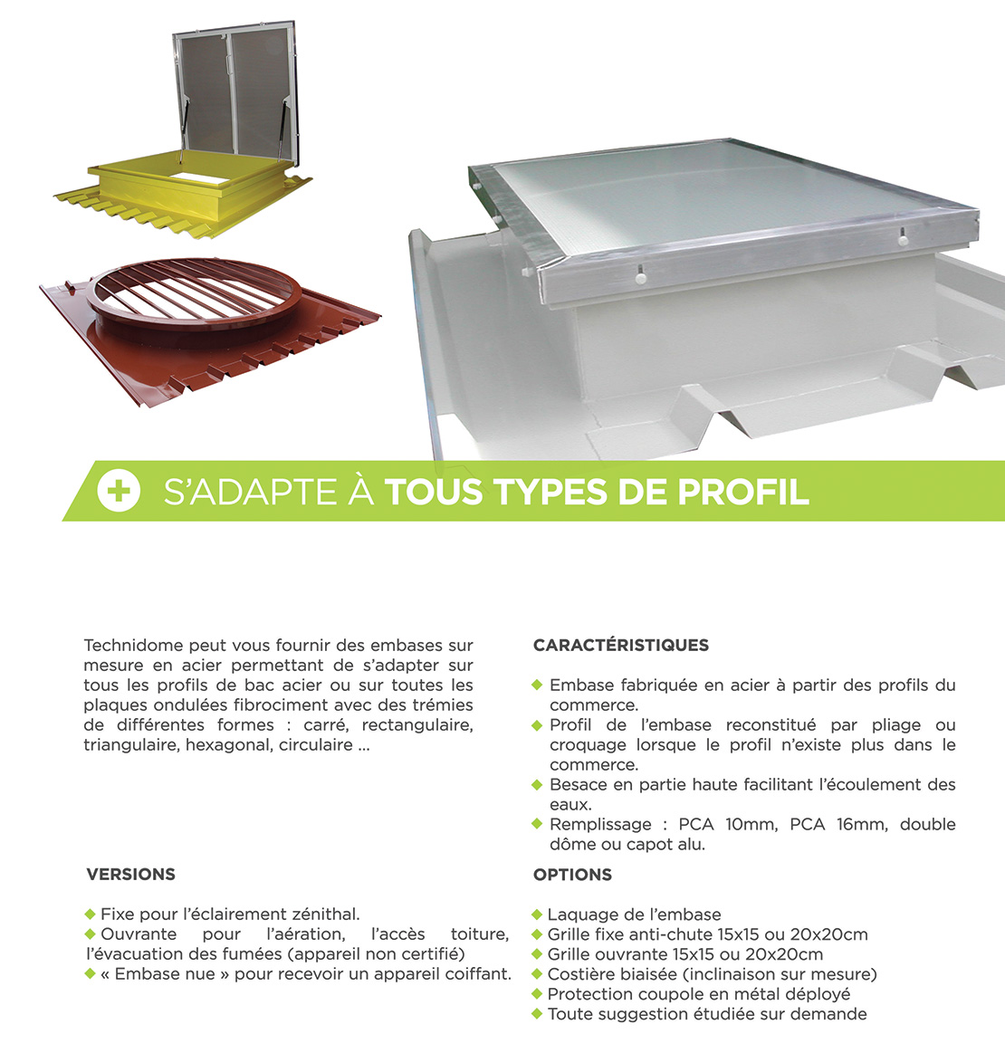 TECHNIDOME peut vous fournir des embases en acier permettant de s'adapter sur tous les profils de bac acier ou les toles ondulées fibrociment. l'embase "sur-mesure" peut s'adapter à toutes les dimensions et avoir une tremie de différentes formes : carré, rectangulaire, triangulaire, circulaire ...