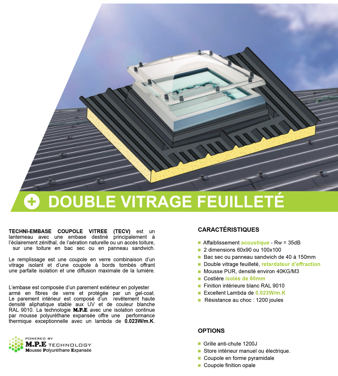 Le remplissage est une coupole en verre combinaison d’un vitrage isolant et d’une coupole à bords tombés Le double vitrage feuilleté apporte une isolation thermique et phonique avec une affaiblissement Acoustique de 35dB (fenêtre coupole pour panneau sandwich isolé)
