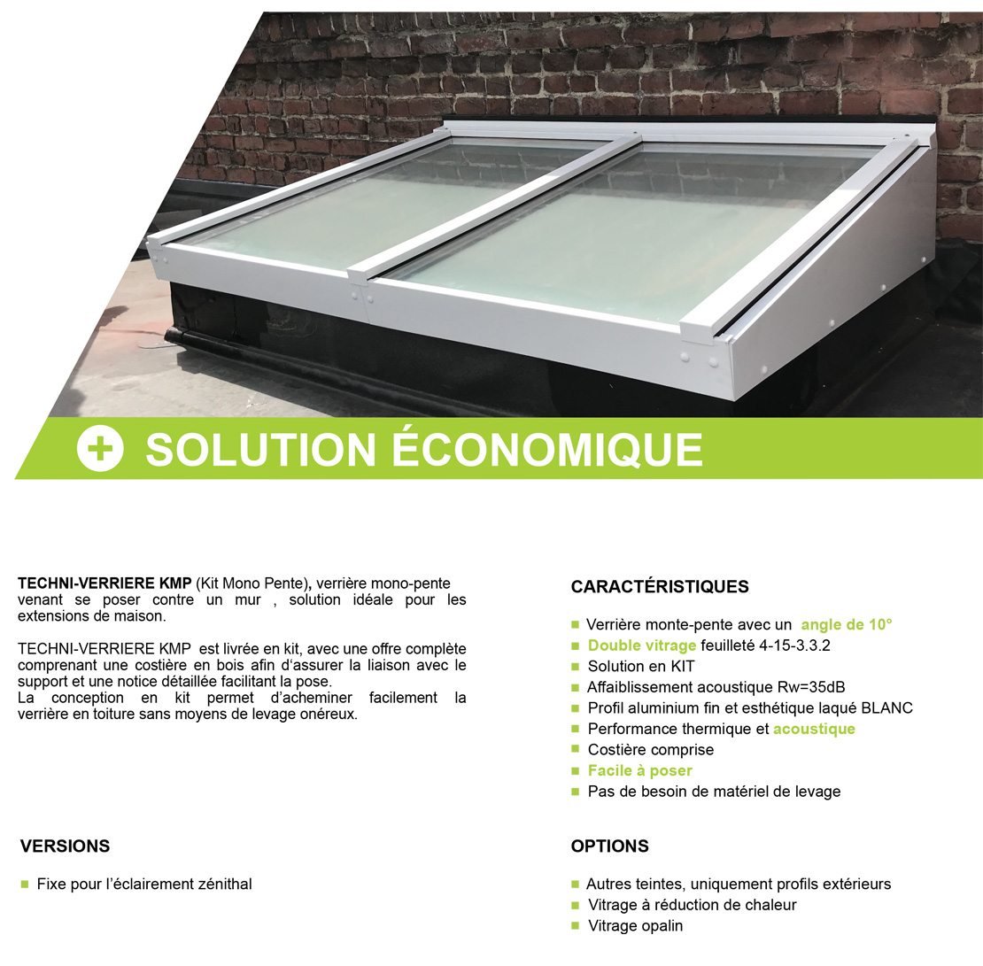 TECHNI-VERRIERE KMP est une verrière de haute qualité avec son double vitrage isolant. Cette verrière mono-pente est livrée en KIT et vient en pose contre mur. La verrière simple versant est idéale pour les extensions de maison avec une toiture plate en bac acier isolée ou en étanchéité bitumineuse.