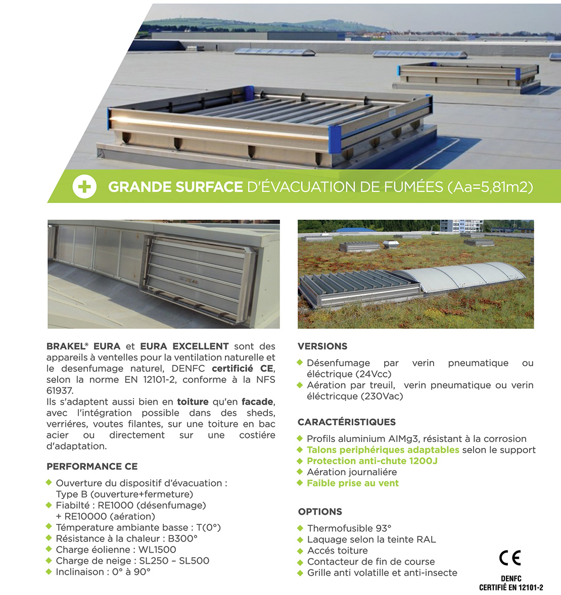 BRAKEL EURA(r) est un appareil à ventelles pour le desenfumage naturelle, certifié CE (DENFC certifié EN12101-2). Cette appareil à lames s'adapte aussi bien en toiture qu'en facade, avec l'intégration possible dans des vérriéres, des sheds en polycarbonate, des voutes filantes ...