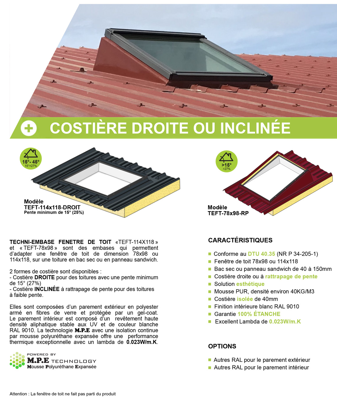 TECHNI-EMBASE FENETRE DE TOIT sont des embases d'adaptation fenêtre de toit, permettant de poser une fenêtre de toit* 78x98 ou une fenêtre de toit 114x118 sur une toiture bac acier ( bac sec ou panneaux sandwich 40mm - 60mm - 80mm - 100mm - 120mm 150mm)